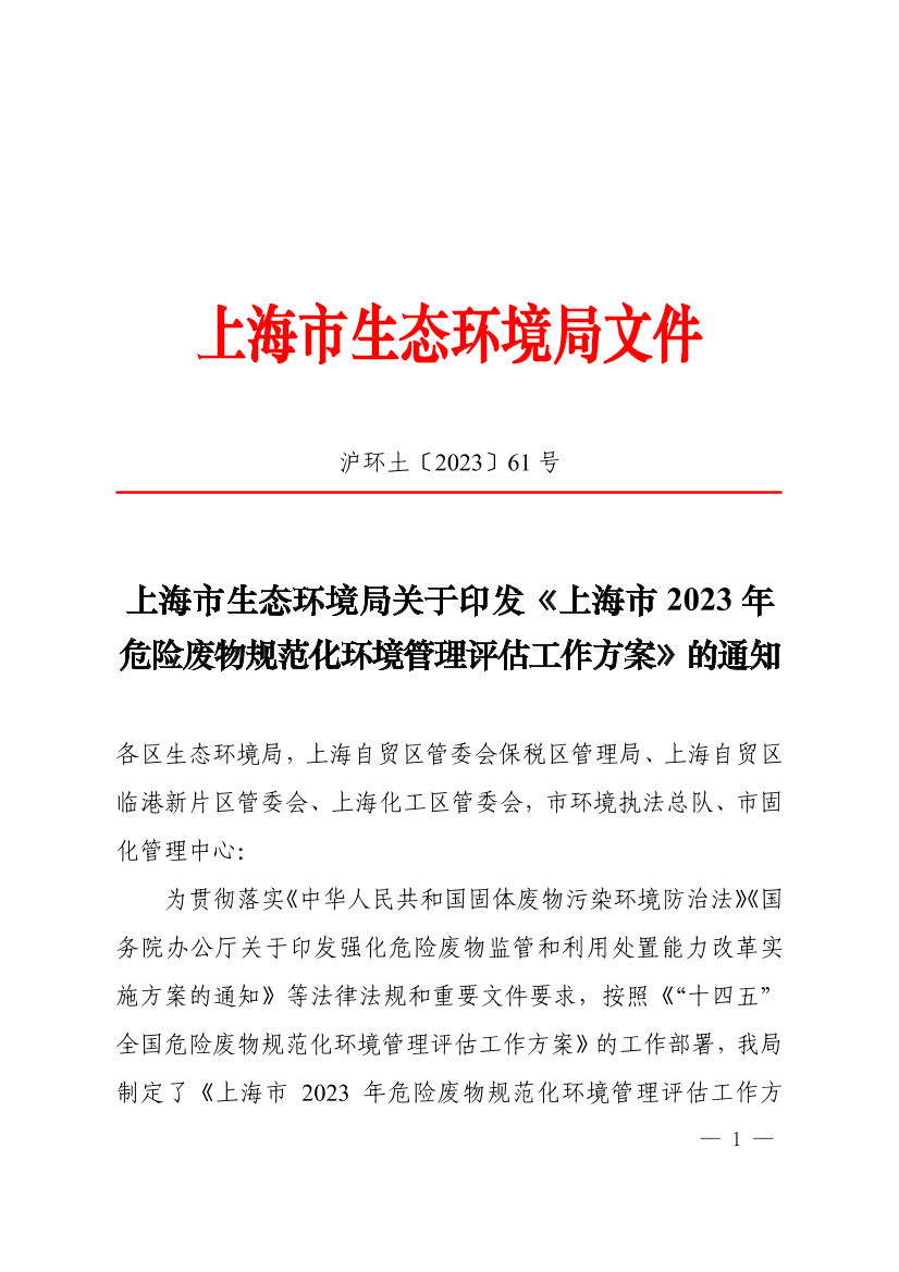 为贯彻落实《中华人民共和国固体废物污染环境防治法》《国务院办公厅关于印发强化危险废物监管和利用处置能力改革实施方案的通知》等法律法规和重要文件要求,按照《“十四五”全国危险废物规范化环境管理评估工作方案》的工作部署,我局制定了《上海市2023年危险废物规范化环境管理评估工作方案》。现印发给你们,请遵照执行。