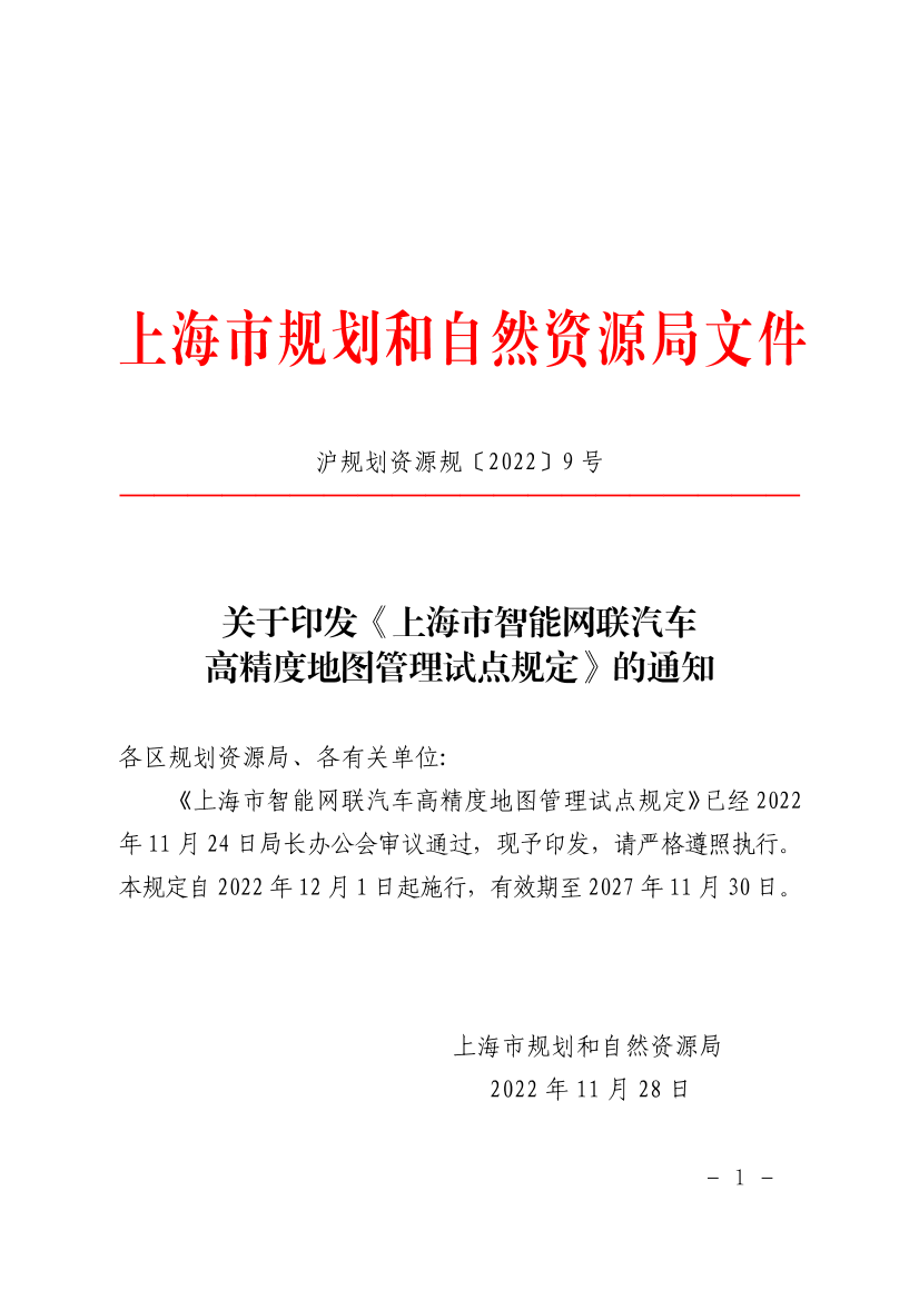 《上海市智能网联汽车高精度地图管理试点规定》已经2022年11月24日局长办公会审议通过,现予印发,请严格遵照执行。本规定自2022年12月1日起施行,有效期至2027年11月30日。