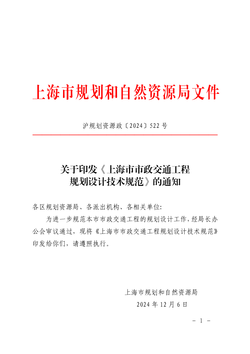 关于印发《上海市市政交通工程规划设计技术规范》的通知