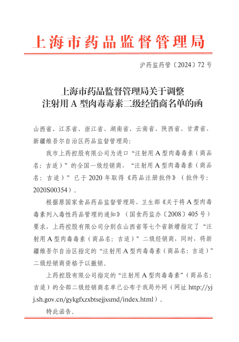 上药控股有限公司指定的“注射用A型肉毒毒素”(商品名:吉适)的全部二级经销商名单已公布于我局外网(网址http://yjj.sh.gov.cn/gykgfxzxbtsejjxsmd/index.html)。