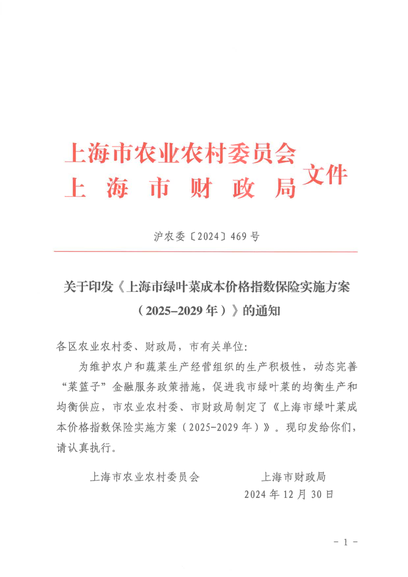 为维护农户和蔬菜生产经营组织的生产积极性,动态完善“菜篮子”金融服务政策措施,促进我市绿叶菜的均衡生产和均衡供应,市农业农村委、市财政局制定了《上海市绿叶菜成本价格指数保险实施方案(2025-2029年)》。现印发给你们,请认真执行。