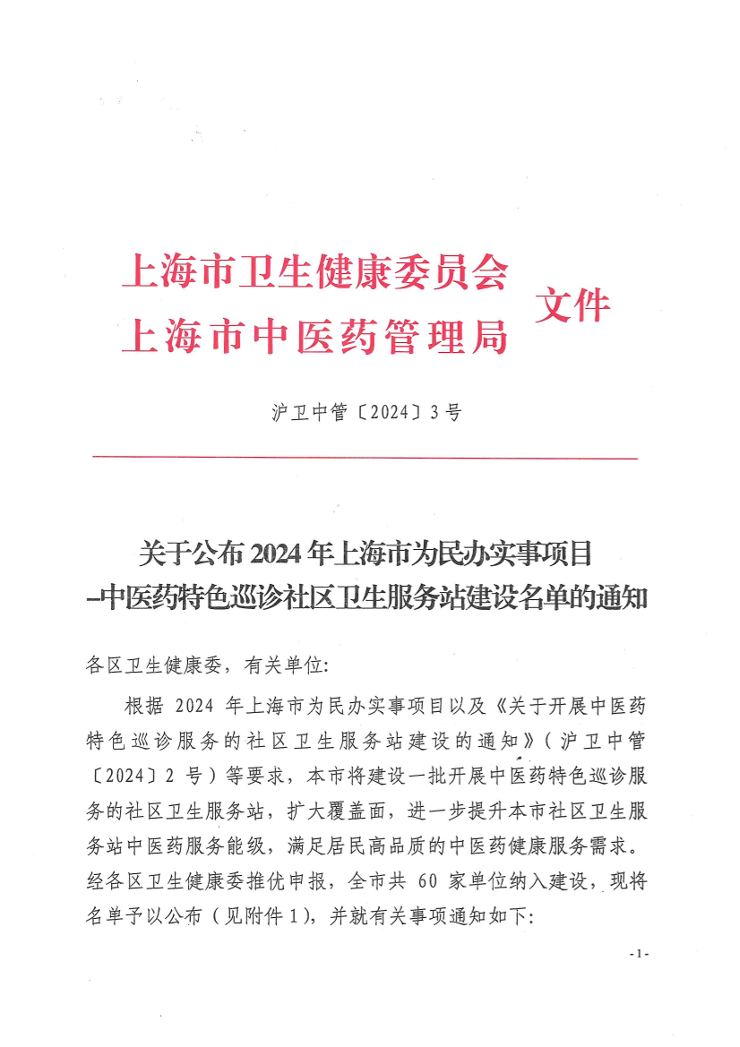 根据2024年上海市为民办实事项目以及《关于开展中医药特色巡诊服务的社区卫生服务站建设的通知》(沪卫中管〔2024〕2号)等要求,本市将建设一批开展中医药特色巡诊服务的社区卫生服务站,扩大覆盖面,进一步提升本市社区卫生服务站中医药服务能级,满足居民高品质的中医药健康服务需求。经各区卫生健康委推优申报,全市共60家单位纳入建设,现将名单予以公布(见附件1),并就有关事项通知如下: