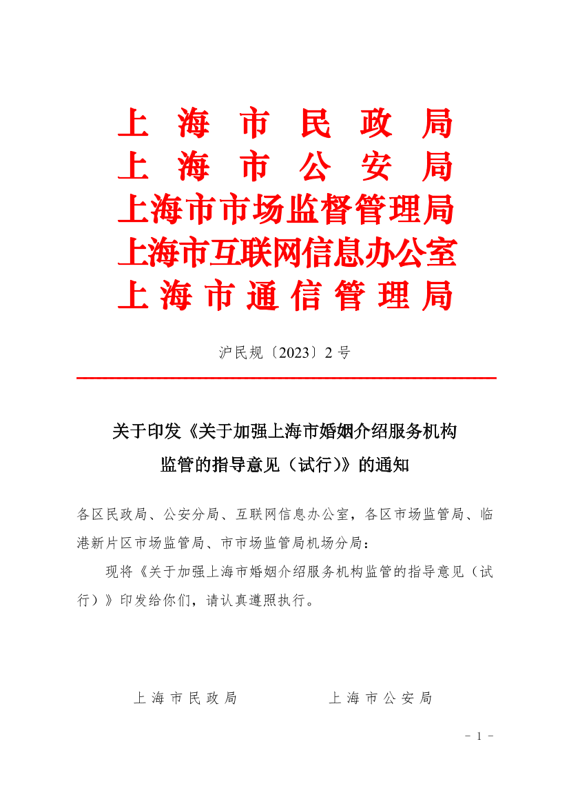 现将《关于加强上海市婚姻介绍服务机构监管的指导意见(试行)》印发给你们,请认真遵照执行。