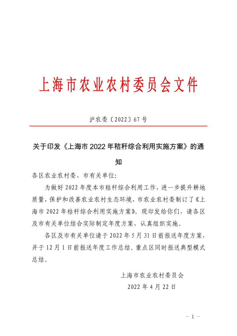 为做好2022年度本市秸秆综合利用工作,进一步提升耕地质量,保护和改善农业农村生态环境,市农业农村委制订了《上海市2022年秸秆综合利用实施方案》。现印发给你们,请各区及市有关单位结合实际制定年度方案,认真组织实施。