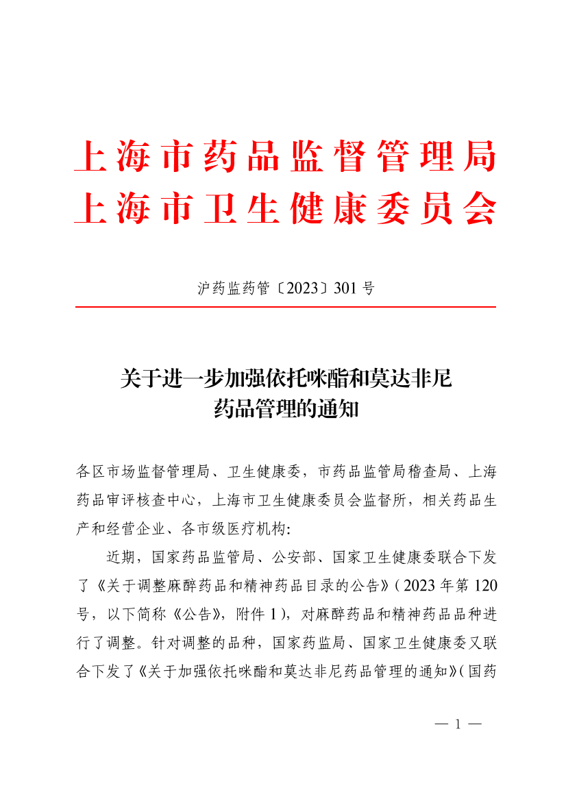 近期,国家药品监管局、公安部、国家卫生健康委联合下发了《关于调整麻醉药品和精神药品目录的公告》(2023年第120号,以下简称《公告》,附件1),对麻醉药品和精神药品品种进行了调整。针对调整的品种,国家药监局、国家卫生健康委又联合下发了《关于加强依托咪酯和莫达非尼药品管理的通知》(国药监药管〔2023〕30号,以下简称《通知》,附件2),根据《公告》和《通知》要求,结合本市无相关药品生产企业的实际,对我市进一步加强依托咪酯和莫达非尼药品等特殊管理药品的安全监管工作提出以下工作要求: