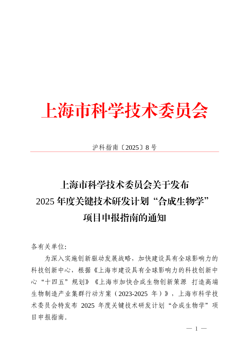 为深入实施创新驱动发展战略,加快建设具有全球影响力的科技创新中心,根据《上海市建设具有全球影响力的科技创新中心“十四五”规划》《上海市加快合成生物创新策源打造高端生物制造产业集群行动方案(2023-2025年)》,上海市科学技术委员会特发布2025年度关键技术研发计划“合成生物学”项目申报指南。