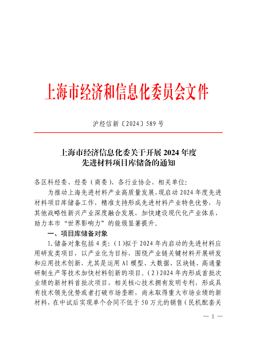 为推动上海先进材料产业高质量发展,现启动2024年度先进材料项目库储备工作,精准支持形成先进材料产业特色优势,与其他战略性新兴产业深度融合发展,加快建设现代化产业体系,助力本市“世界影响力”的能级显著提升。