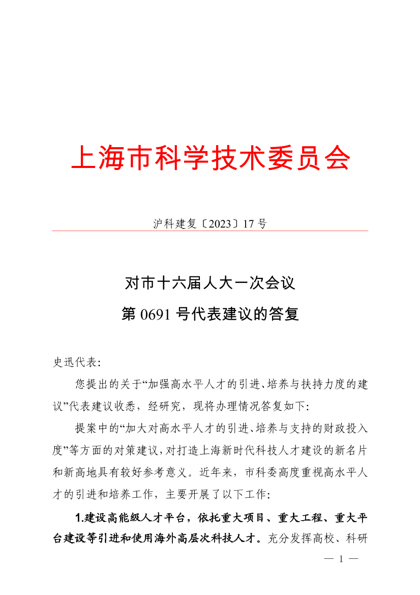 您提出的关于“加强高水平人才的引进、培养与扶持力度的建议”代表建议收悉,经研究,现将办理情况答复如下:
