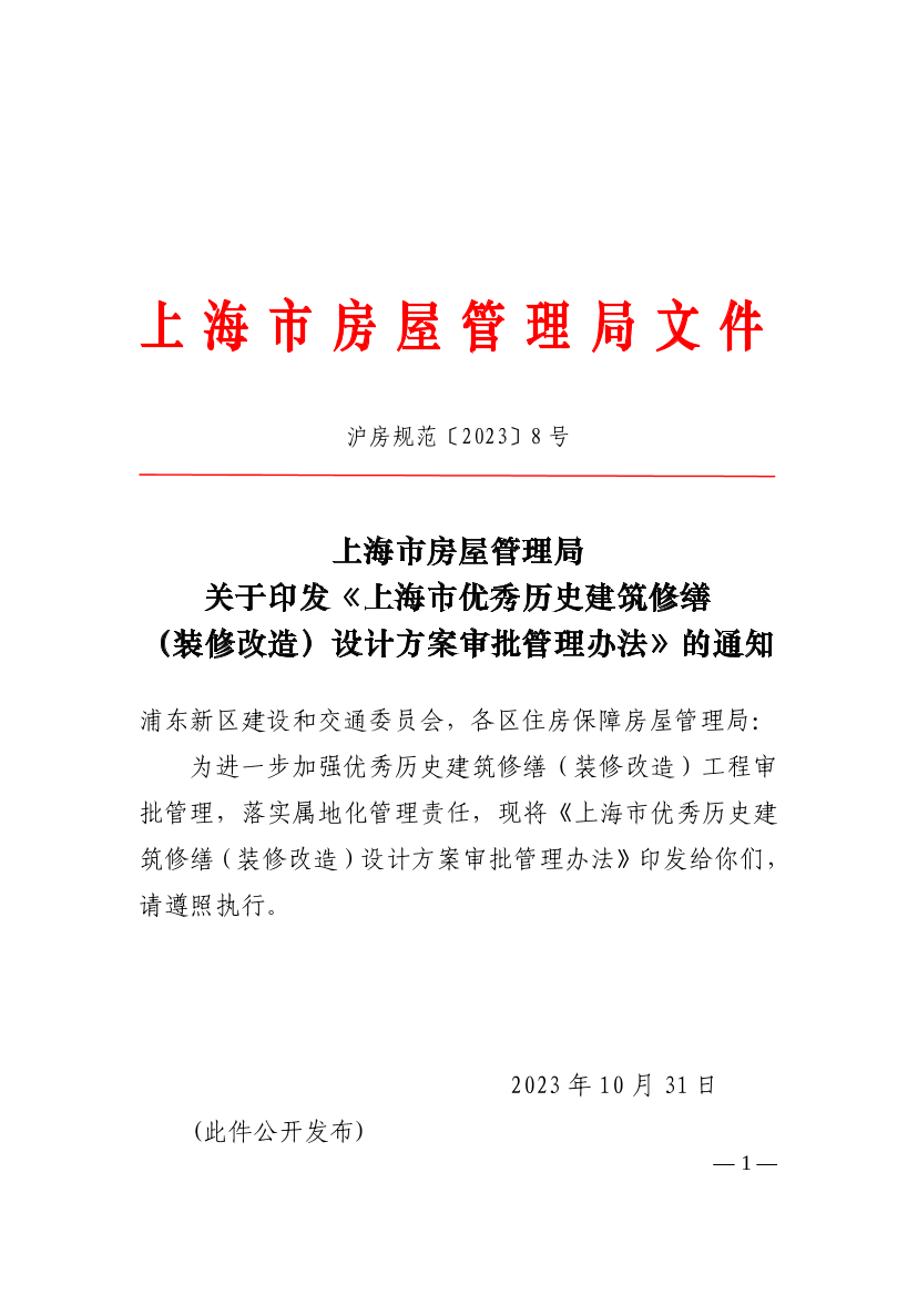 上海市房屋管理局 关于印发《上海市优秀历史建筑修缮(装修改造)设计方案审批管理办法》的通知