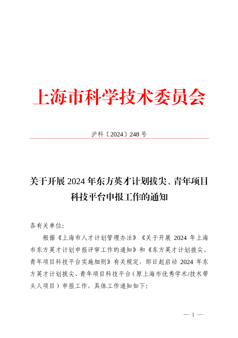 根据《上海市人才计划管理办法》《关于开展2024年上海市东方英才计划申报评审工作的通知》和《东方英才计划拔尖、青年项目科技平台实施细则》有关规定,即日起启动2024年东方英才计划拔尖、青年项目科技平台(原上海市优秀学术/技术带头人项目)申报工作,具体工作通知如下: