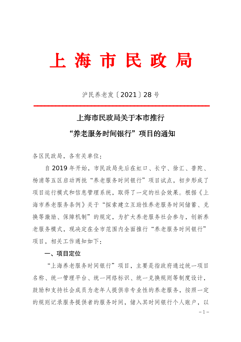 自2019年开始,市民政局先后在虹口、长宁、徐汇、普陀、杨浦等五区启动两批“养老服务时间银行”项目试点,初步形成了项目运行模式和信息管理系统,取得了一定的社会效果。根据《上海市养老服务条例》关于“探索建立互助性养老服务时间储蓄、兑换等激励、保障机制”的规定,为扩大养老服务社会参与,创新养老服务模式,现决定在全市范围内全面推行“养老服务时间银行”项目,相关工作通知如下:
