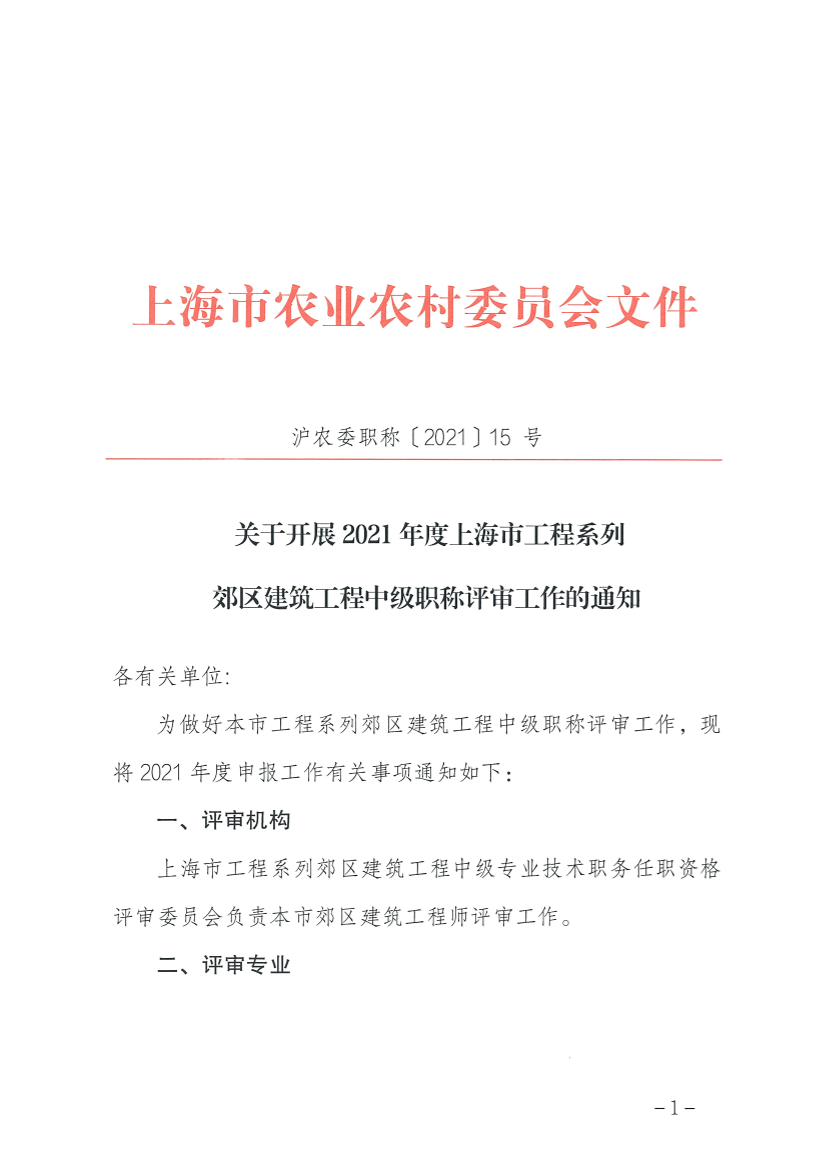 为做好本市工程系列郊区建筑工程中级职称评审工作,现将2021年度申报工作有关事项通知如下: