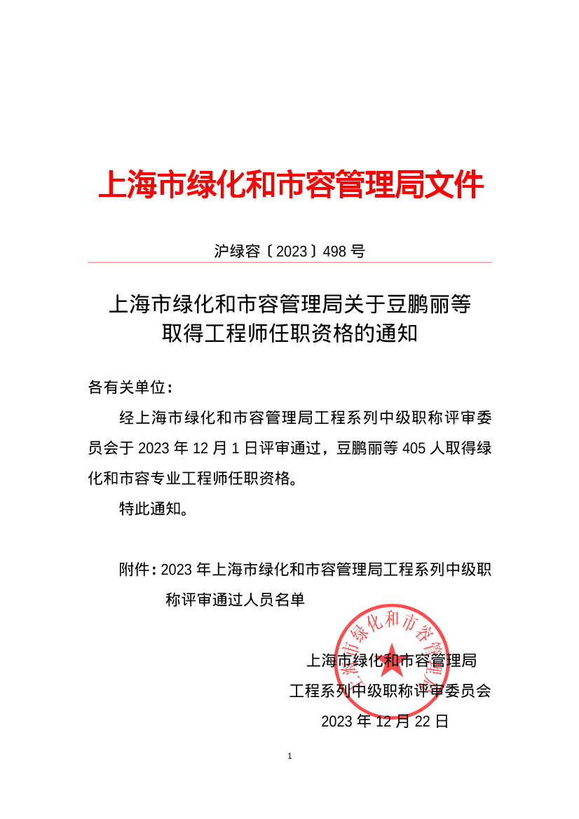 经上海市绿化和市容管理局工程系列中级职称评审委员会于 2023年 12月 1 日评审通过,豆鹏丽等 405人取得绿化和市容专业工程师任职资格。