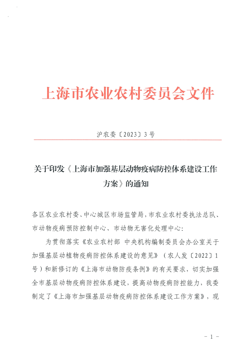 为贯彻落实《农业农村部 中央机构编制委员会办公室关于加强基层动植物疫病防控体系建设的意见》(农人发〔2022〕1号)和新修订的《上海市动物防疫条例》的有关要求,切实加强全市基层动物疫病防控体系建设,提高动物疫病防控能力,我委制定了《上海市加强基层动物疫病防控体系建设工作方案》,现印发给你们,请结合实际认真贯彻执行。