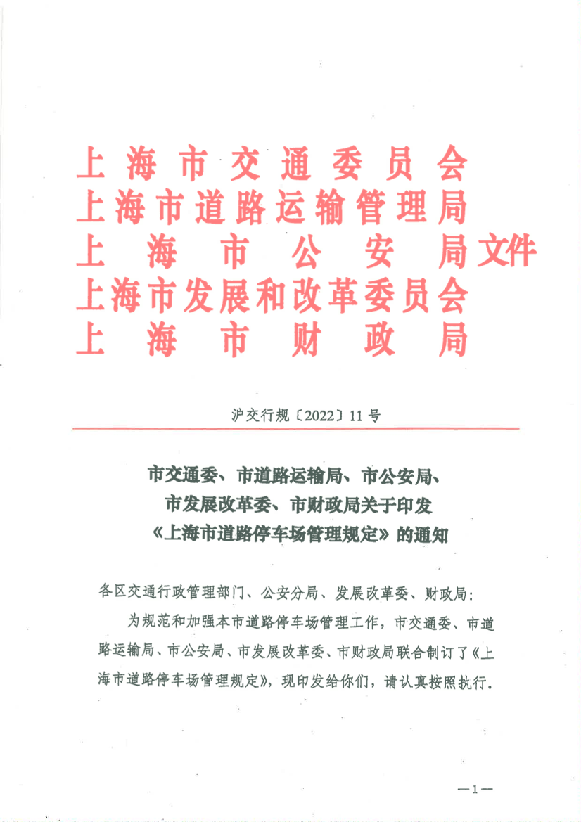 为规范和加强本市道路停车场管理工作,市交通委、市道路运输局、市公安局、市发展改革委、市财政局联合制订了《上海市道路停车场管理规定》,现印发给你们,请认真按照执行。