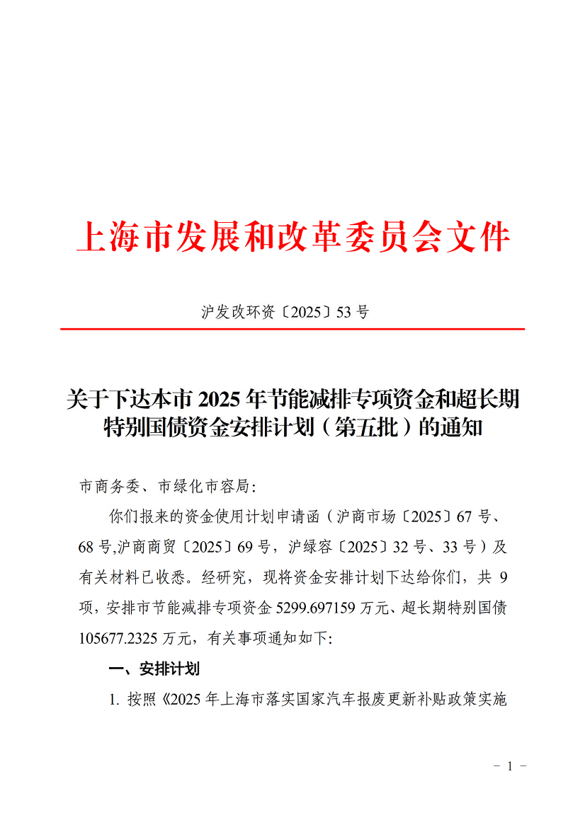 2. 按照《2025年上海市汽车置换更新补贴政策实施细则》(沪商市场〔2025〕21号)规定,安排经审核通过的2025年第一批2965人次本市汽车置换更新(燃油车)补贴资金,由市节能减排专项资金安排578.175万元、2025年超长期特别国债安排3276.325万元,合计3854.5万元。