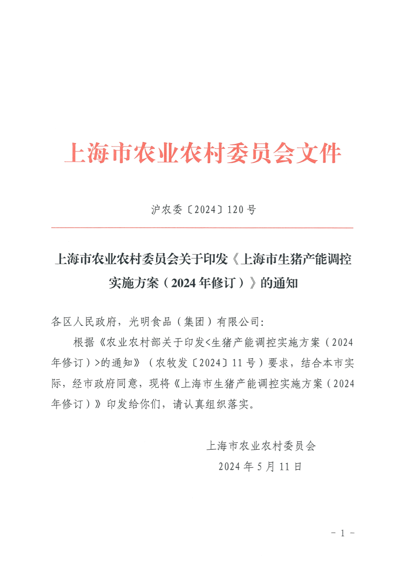 根据《农业农村部关于印发<生猪产能调控实施方案(2024年修订)>的通知》(农牧发〔2024〕11号)要求,结合本市实际,经市政府同意,现将《上海市生猪产能调控实施方案(2024年修订)》印发给你们,请认真组织落实。