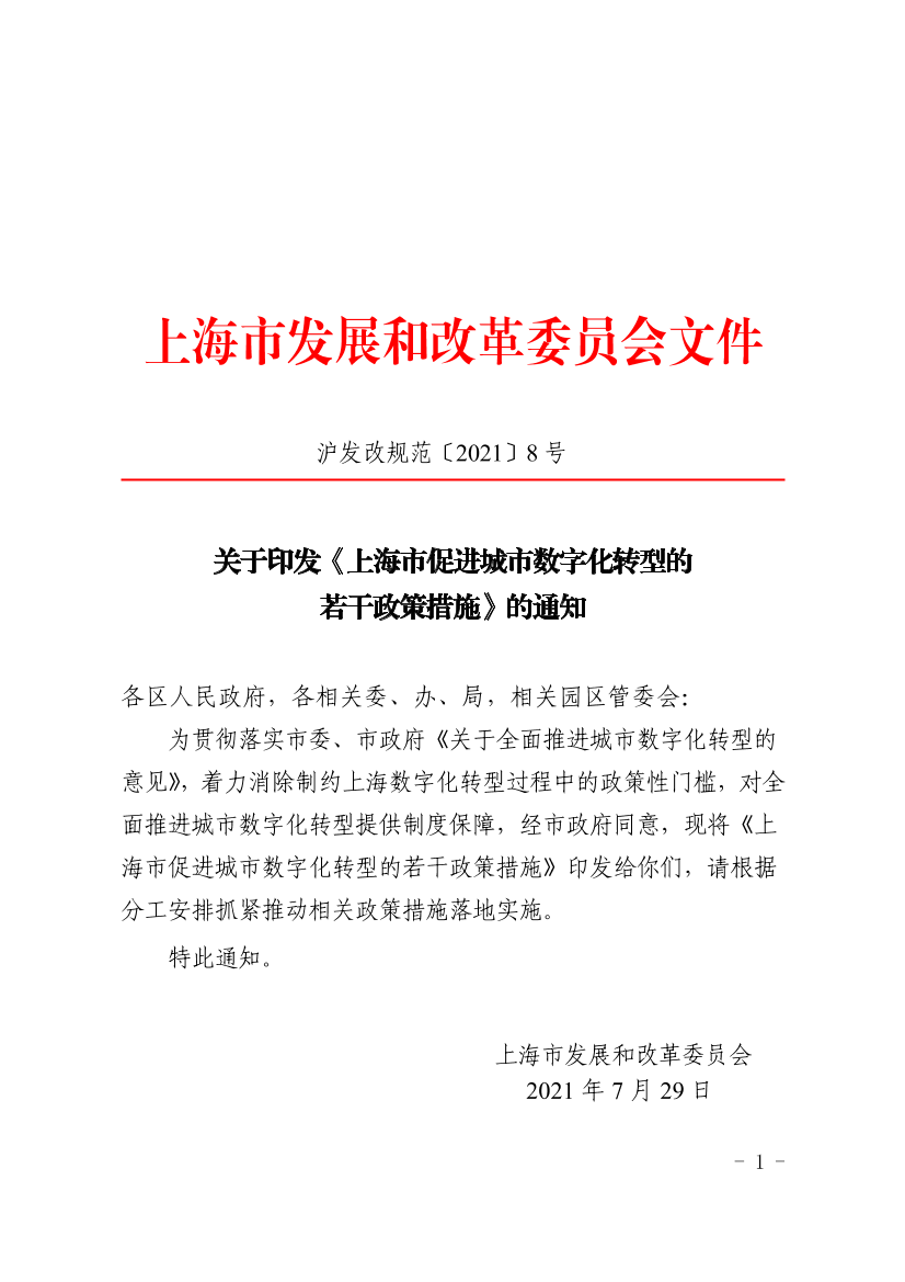 为贯彻落实市委、市政府《关于全面推进城市数字化转型的意见》,着力消除制约上海数字化转型过程中的政策性门槛,对全面推进城市数字化转型提供制度保障,经市政府同意,现将《上海市促进城市数字化转型的若干政策措施》印发给你们,请根据分工安排抓紧推动相关政策措施落地实施。