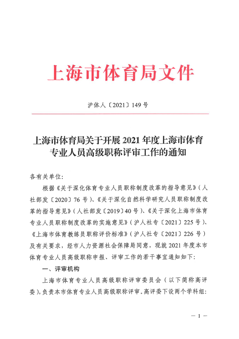 根据《关于深化体育专业人员职称制度改革的指导意见》(人社部发〔2020〕76号)、《关于深化自然科学研究人员职称制度改革的指导意见》(人社部发〔2019〕40号)、《关于深化上海市体育专业人员职称制度改革的实施意见》(沪人社专〔2021〕225号)、《上海市体育教练员职称评价标准》(沪人社专〔2021〕226号)及有关要求,经市人力资源社会保障局同意,现就2021年度本市体育专业人员高级职称申报、评审工作的若干事宜通知如下: