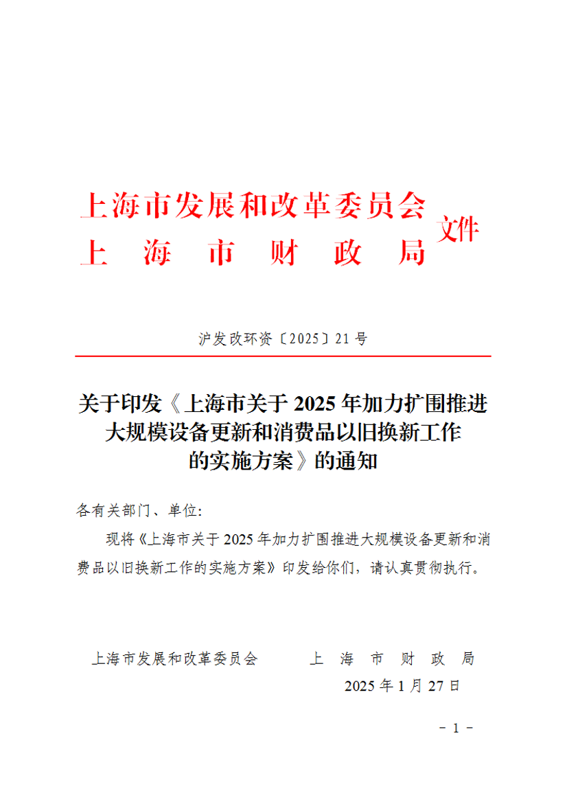 现将《上海市关于2025年加力扩围推进大规模设备更新和消费品以旧换新工作的实施方案》印发给你们,请认真贯彻执行。