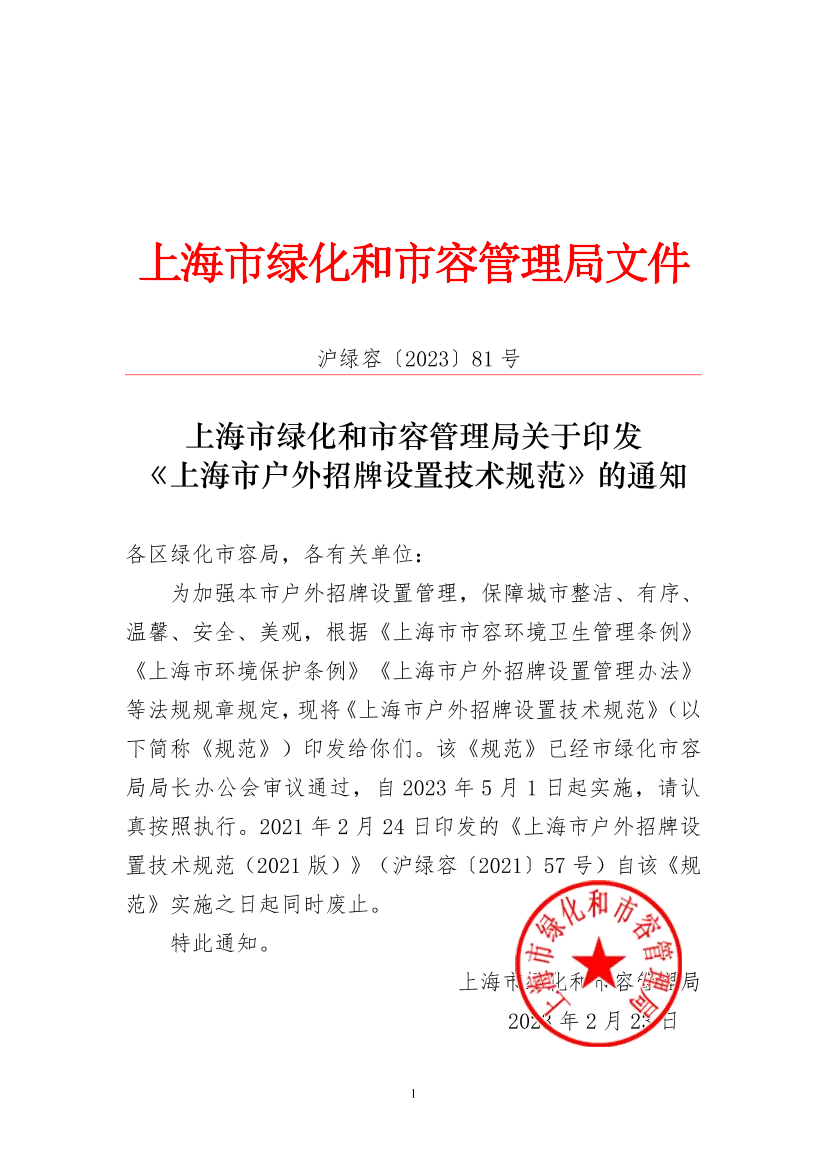 为加强本市户外招牌设置管理,保障城市整洁、有序、温馨、安全、美观,根据《上海市市容环境卫生管理条例》《上海市环境保护条例》《上海市户外招牌设置管理办法》等法规规章规定,现将《上海市户外招牌设置技术规范》(以下简称《规范》)印发给你们。该《规范》已经市绿化市容局局长办公会审议通过,自2023年5月1日起实施,请认真按照执行。2021年2月24日印发的《上海市户外招牌设置技术规范(2021版)》(沪绿容〔2021〕57号)自该《规范》实施之日起同时废止。