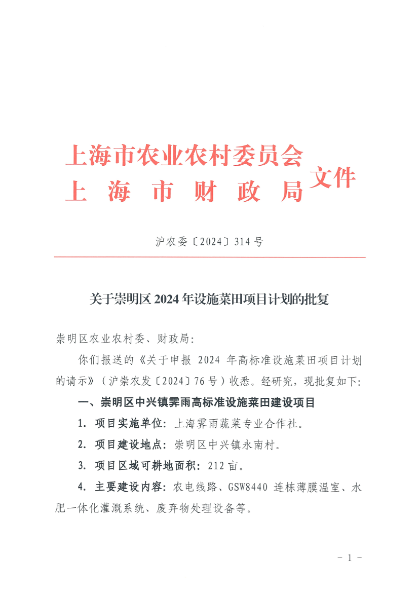 你们报送的《关于申报 2024 年高标准设施菜田项目计划的请示》(沪崇农发〔2024〕76号)收悉。经研究,现批复如下: