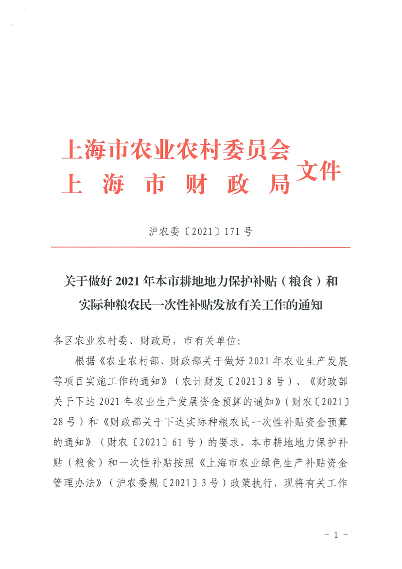 根据《农业农村部、财政部关于做好2021年农业生产发展等项目实施工作的通知》(农计财发〔2021〕8号)、《财政部关于下达2021年农业生产发展资金预算的通知》(财农〔2021〕28号)和《财政部关于下达实际种粮农民一次性补贴资金预算的通知》(财农〔2021〕61号)的要求,本市耕地地力保护补贴(粮食)和一次性补贴按照《上海市农业绿色生产补贴资金管理办法》(沪农委规〔2021〕3号)政策执行,现将有关工作通知如下:
