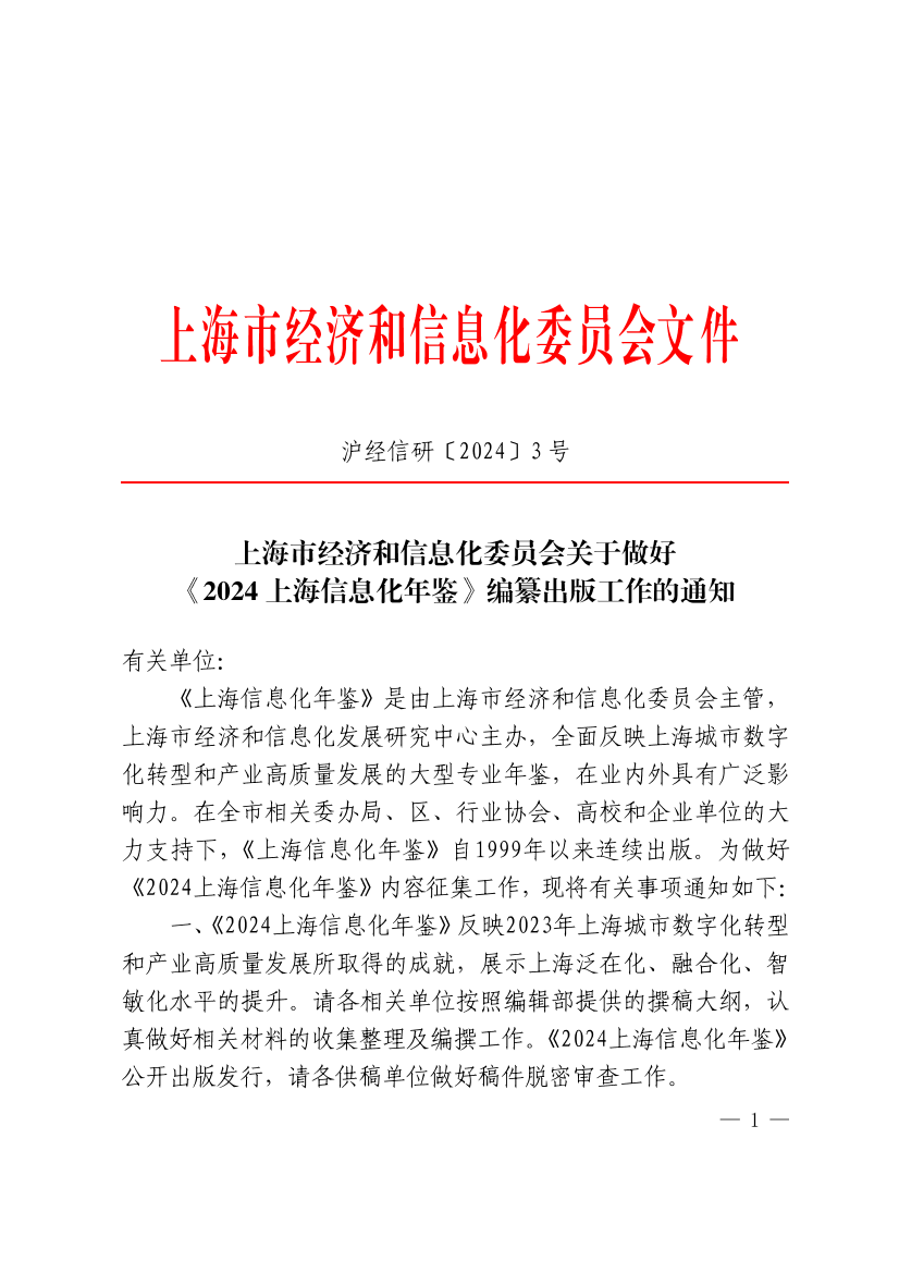 一、《2024上海信息化年鉴》反映2023年上海城市数字化转型和产业高质量发展所取得的成就,展示上海泛在化、融合化、智敏化水平的提升。请各相关单位按照编辑部提供的撰稿大纲,认真做好相关材料的收集整理及编撰工作。《2024上海信息化年鉴》公开出版发行,请各供稿单位做好稿件脱密审查工作。