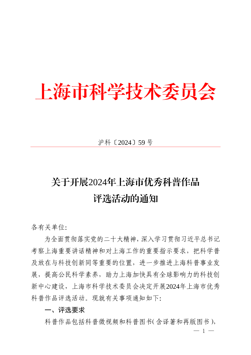 为全面贯彻落实党的二十大精神,深入学习贯彻习近平总书记考察上海重要讲话精神和对上海工作的重要指示要求,把科学普及放在与科技创新同等重要的位置,进一步推进上海科普事业发展,提高公民科学素养,助力上海加快具有全球影响力的科技创新中心建设,上海市科学技术委员会决定开展2024年上海市优秀科普作品评选活动。现就有关事项通知如下: