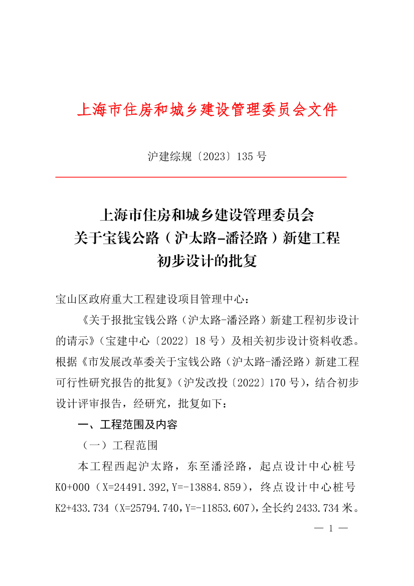 《关于报批宝钱公路(沪太路-潘泾路)新建工程初步设计的请示》(宝建中心〔2022〕18号)及相关初步设计资料收悉。根据《市发展改革委关于宝钱公路(沪太路-潘泾路)新建工程可行性研究报告的批复》(沪发改投〔2022〕170号),结合初步设计评审报告,经研究,批复如下: