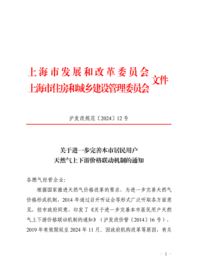 根据国家推进天然气价格改革的要求,为进一步完善天然气价格形成机制,2014年通过召开听证会等形式广泛听取各方面意见,经市政府同意,印发了《关于进一步完善本市居民用户天然气上下游价格联动机制的通知》(沪发改价管〔2014〕16号),2019年有效期延至2024年11月。因政府机构改革等原因,有关机构名称发生变化,现根据规范性文件管理相关规定,对机构名称进行修改,有关事项通知如下: