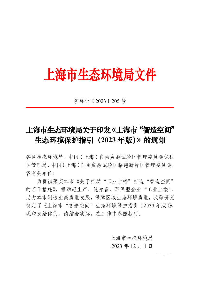 为贯彻落实本市《关于推动“工业上楼”打造“智造空间”的若干措施》,推动轻生产、低噪音、环保型企业“工业上楼”,助力本市制造业高质量发展,保障区域生态环境质量,我局研究制定了《上海市“智造空间”生态环境保护指引(2023年版)》,现印发给你们,请结合实际,在工作中参照执行。