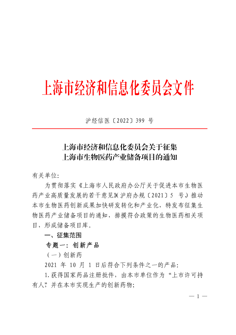 为贯彻落实《上海市人民政府办公厅关于促进本市生物医药产业高质量发展的若干意见》(沪府办规〔2021〕5号),推动本市生物医药创新成果加快研发转化和产业化,特发布征集生物医药产业储备项目的通知,排摸符合政策的生物医药相关项目,形成储备项目库。