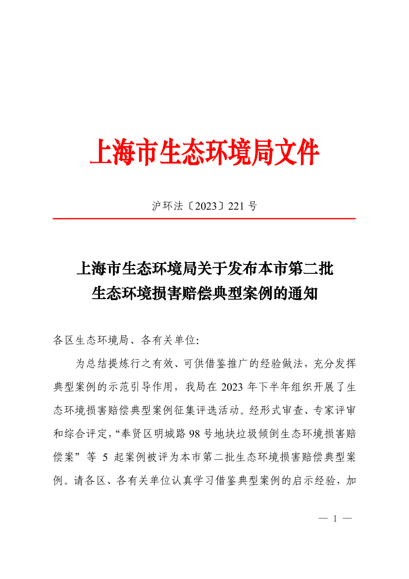 为总结提炼行之有效、可供借鉴推广的经验做法,充分发挥典型案例的示范引导作用,我局在2023年下半年组织开展了生态环境损害赔偿典型案例征集评选活动。经形式审查、专家评审和综合评定,“奉贤区明城路98号地块垃圾倾倒生态环境损害赔偿案”等5起案例被评为本市第二批生态环境损害赔偿典型案例。请各区、各有关单位认真学习借鉴典型案例的启示经验,加强案例实践和总结,持续推进生态环境损害赔偿工作制度化、常态化和规范化。