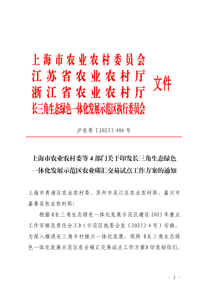 根据《长三角生态绿色一体化发展示范区建设2023年重点工作安排及责任分工》(示范区执委会发〔2023〕4号)安排,为深入推进长三角乡村振兴一体化发展,现将《长三角生态绿色一体化发展示范区农业碳汇交易试点工作方案》印发给你们,请认真贯彻执行。