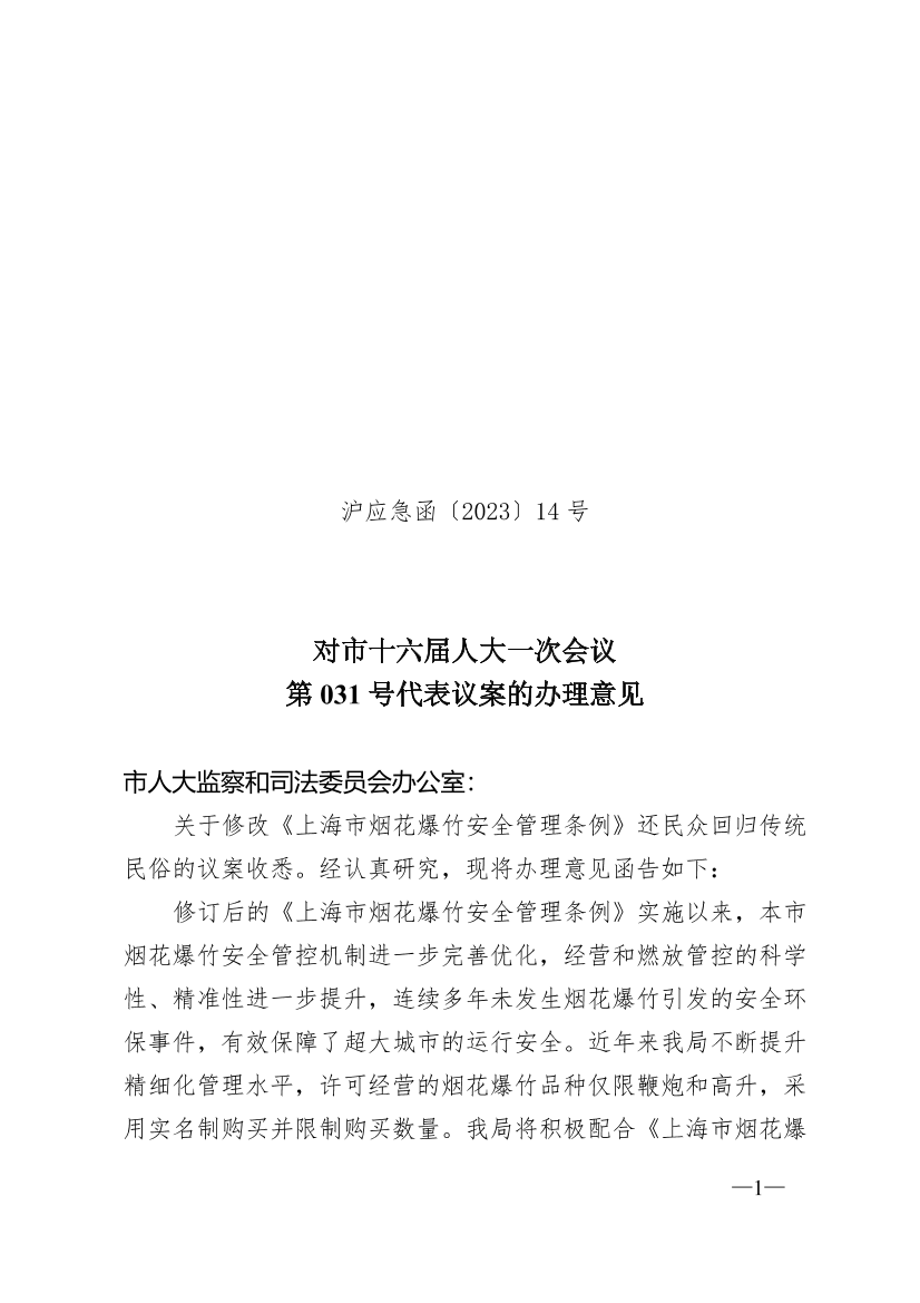 关于修改《上海市烟花爆竹安全管理条例》还民众回归传统民俗的议案收悉。经认真研究,现将办理意见函告如下:
