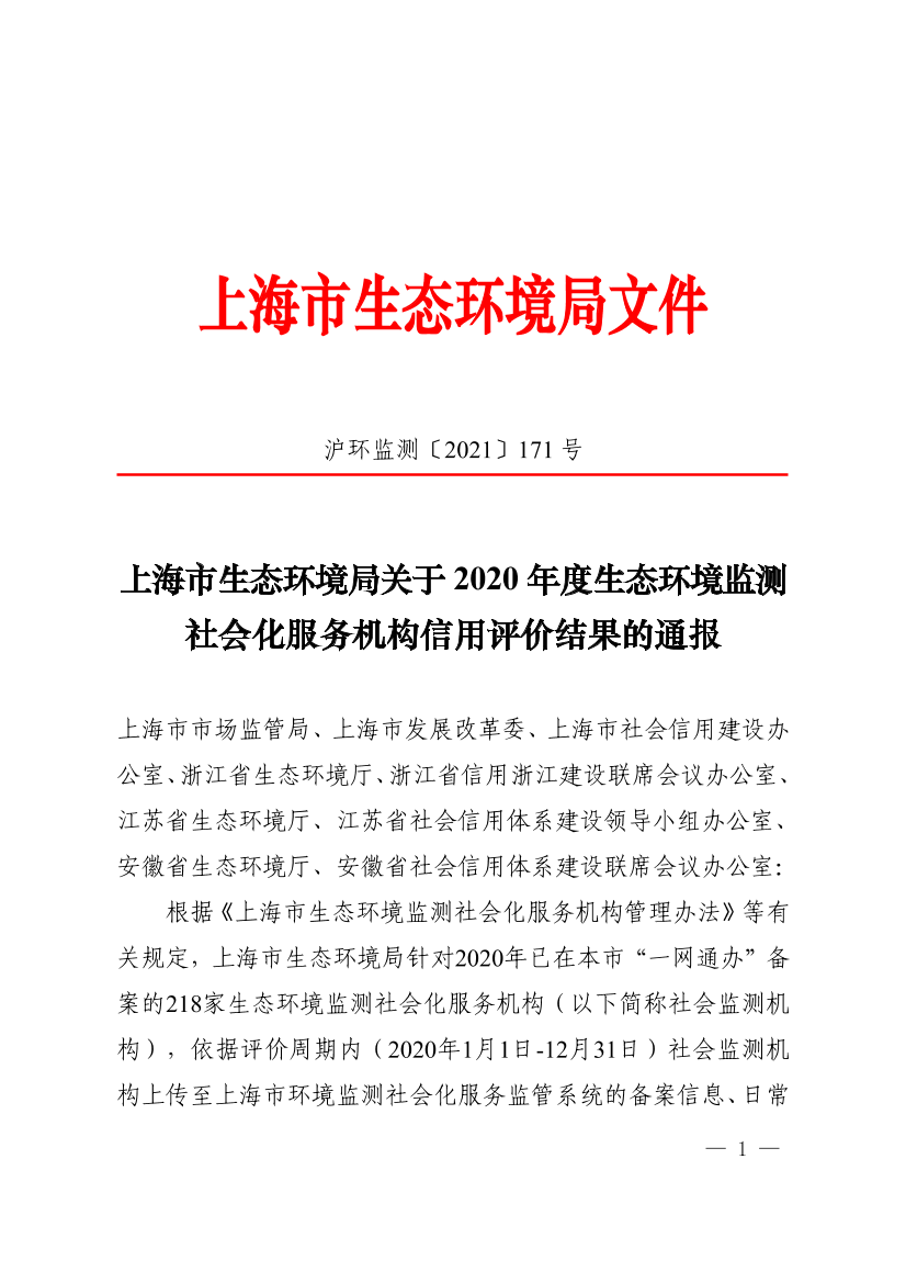 按照《长三角区域生态环境领域实施信用联合奖惩合作备忘录(2020年版)》等文件精神,现将上海市2020年度社会监测机构信用评价结果的通报如下: