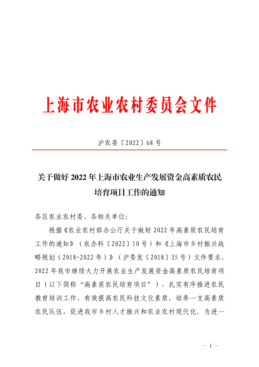 根据《农业农村部办公厅关于做好2022年高素质农民培育工作的通知》(农办科〔2022〕10号)和《上海市乡村振兴战略规划(2018-2022年)》(沪委发〔2018〕35号)文件要求,2022年我市继续大力开展农业生产发展资金高素质农民培育项目(以下简称“高素质农民培育项目”),扎实有序推进农民教育培训工作,有效提高农民科技文化素质,培养一支高素质农民队伍,促进我市乡村人才振兴和农业农村现代化。为进一步优化资金任务安排,提高资金使用效益,按照农业生产发展资金项目实施要求,现就有关事项通知如下。