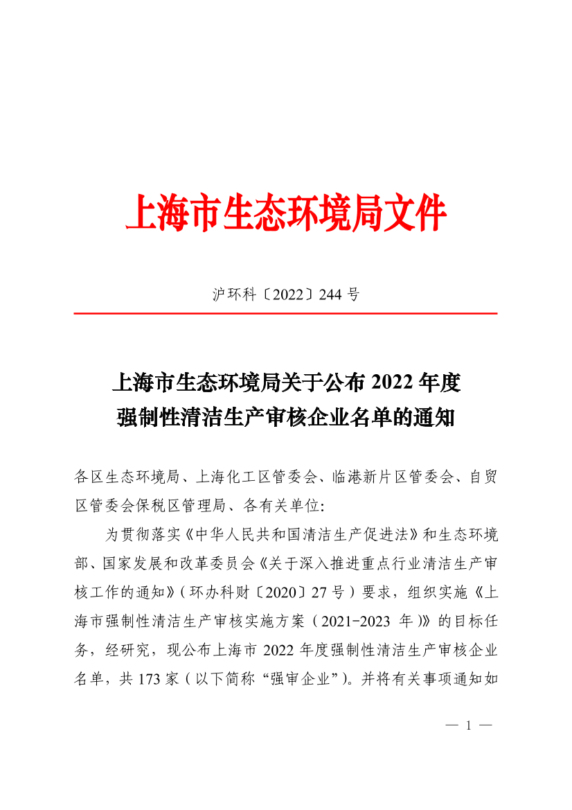 为贯彻落实《中华人民共和国清洁生产促进法》和生态环境部、国家发展和改革委员会《关于深入推进重点行业清洁生产审核工作的通知》(环办科财〔2020〕27号)要求,组织实施《上海市强制性清洁生产审核实施方案(2021-2023年)》的目标任务,经研究,现公布上海市2022年度强制性清洁生产审核企业名单,共173家(以下简称“强审企业”)。并将有关事项通知如下: