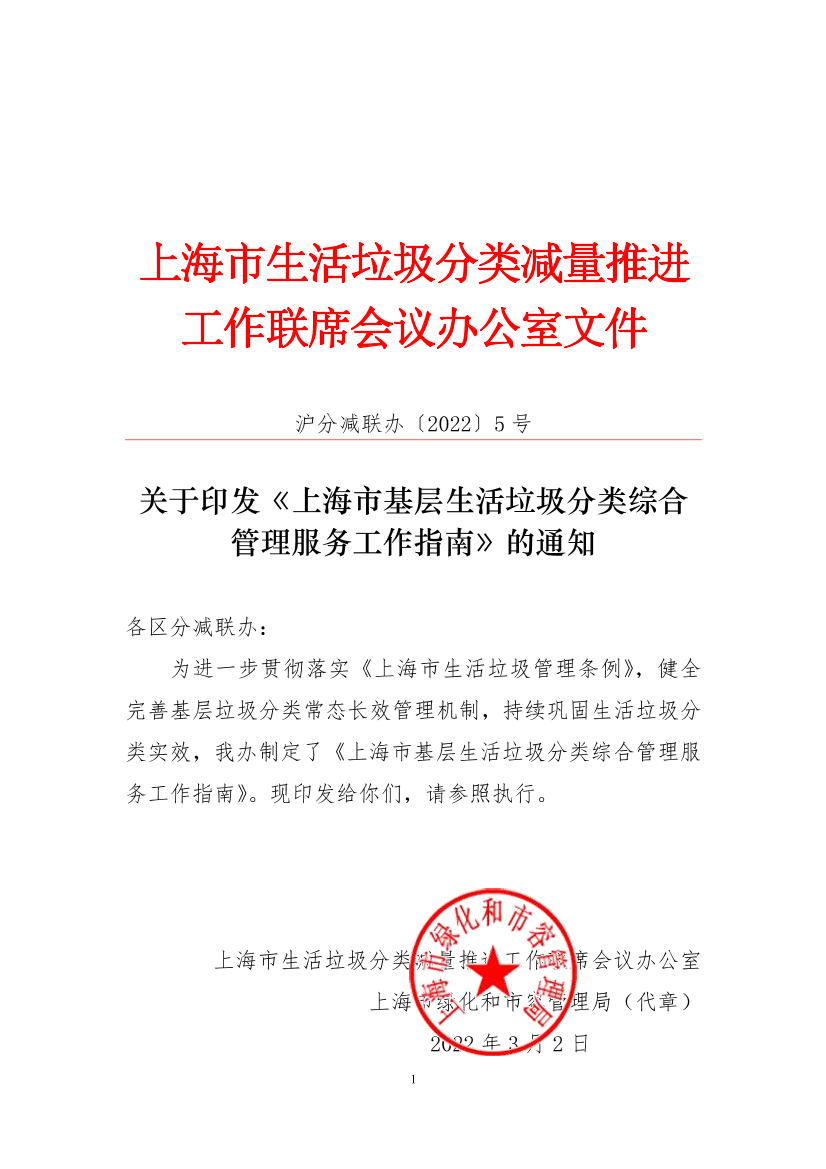 为进一步贯彻落实《上海市生活垃圾管理条例》,健全完善基层垃圾分类常态长效管理机制,持续巩固生活垃圾分类实效,我办制定了《上海市基层生活垃圾分类综合管理服务工作指南》。现印发给你们,请参照执行。