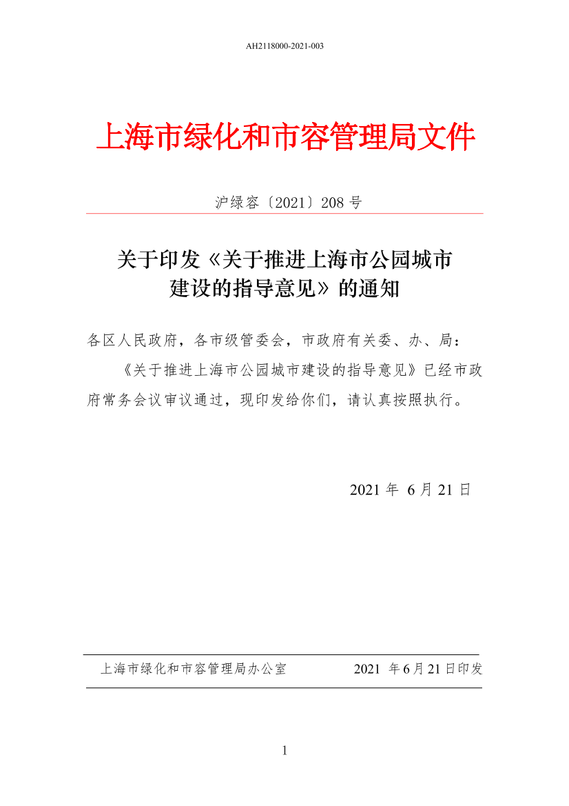 《关于推进上海市公园城市建设的指导意见》已经市政府常务会议审议通过,现印发给你们,请认真按照执行。