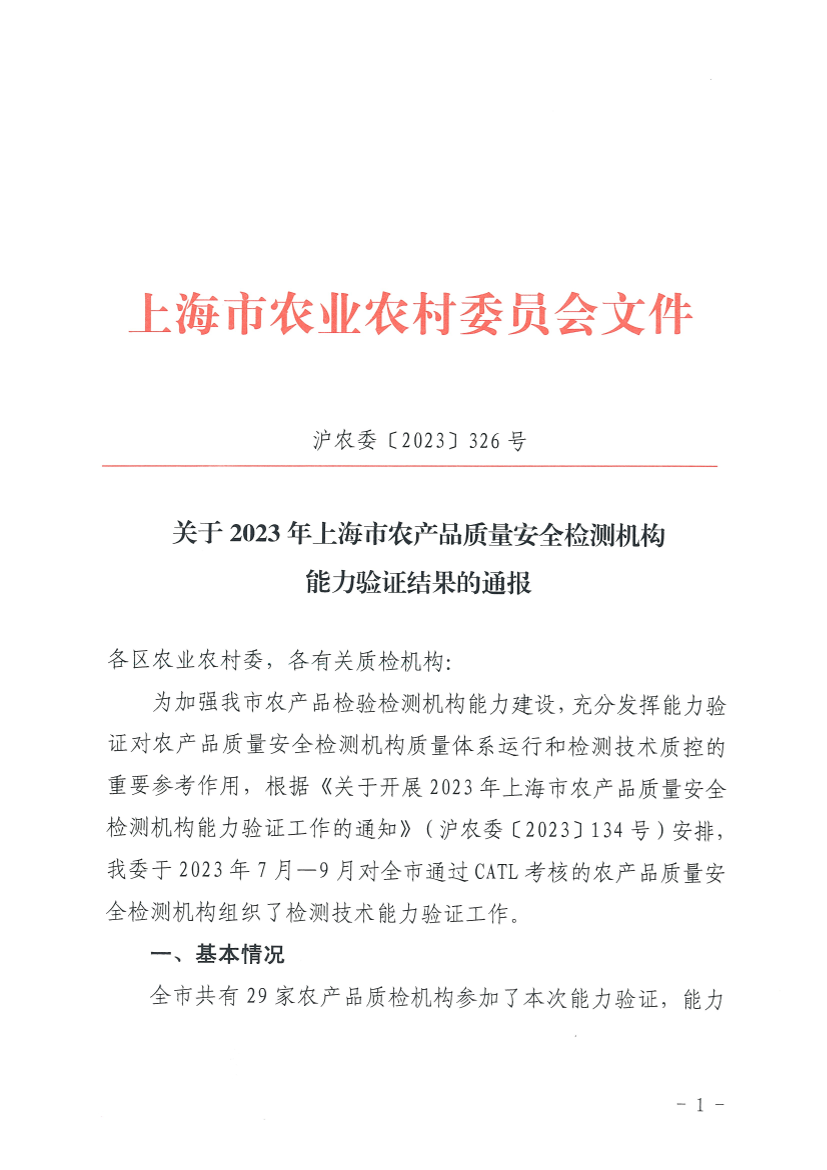 为加强我市农产品检验检测机构能力建设,充分发挥能力验证对农产品质量安全检测机构质量体系运行和检测技术质控的重要参考作用,根据《关于开展2023年上海市农产品质量安全检测机构能力验证工作的通知》(沪农委〔2023〕134号)安排,我委于2023年7月—9月对全市通过CATL考核的农产品质量安全检测机构组织了检测技术能力验证工作。