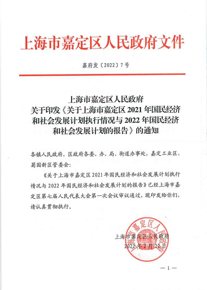 《关于上海市嘉定区2021年国民经济和社会发展计划执行情况与2022年国民经济和社会发展计划的报告》已经上海市嘉定区第七届人民代表大会第一次会议审议通过,现印发给你们,请认真贯彻执行。