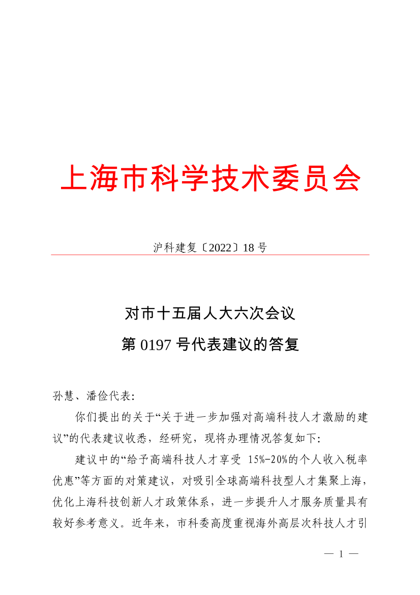 你们提出的关于“关于进一步加强对高端科技人才激励的建议”的代表建议收悉,经研究,现将办理情况答复如下:
