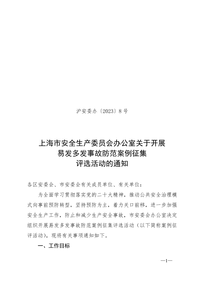 为全面学习贯彻落实党的二十大精神,推动公共安全治理模式向事前预防转型,坚持预防为主,着力关口前移,进一步加强安全生产工作,防止和减少生产安全事故,市安委会办公室决定组织开展易发多发事故防范案例征集评选活动(以下简称案例征评活动),现将有关事项通知如下。