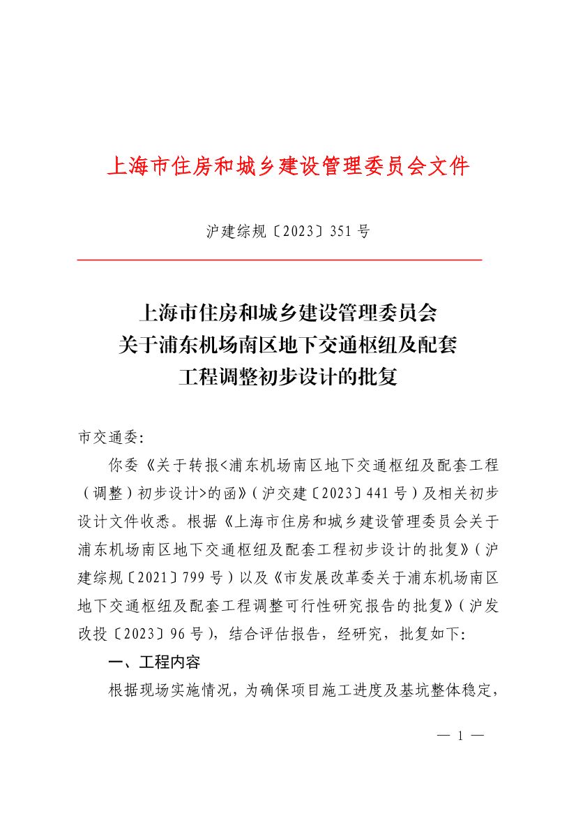 你委《关于转报<浦东机场南区地下交通枢纽及配套工程(调整)初步设计>的函》(沪交建〔2023〕441号)及相关初步设计文件收悉。根据《上海市住房和城乡建设管理委员会关于浦东机场南区地下交通枢纽及配套工程初步设计的批复》(沪建综规〔2021〕799号)以及《市发展改革委关于浦东机场南区地下交通枢纽及配套工程调整可行性研究报告的批复》(沪发改投〔2023〕96号),结合评估报告,经研究,批复如下: