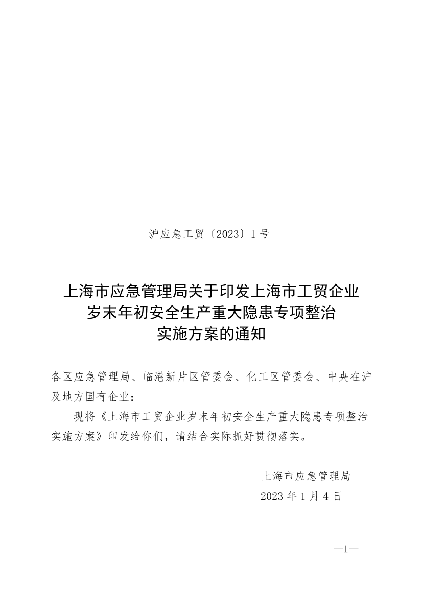 现将《上海市工贸企业岁末年初安全生产重大隐患专项整治实施方案》印发给你们,请结合实际抓好贯彻落实。