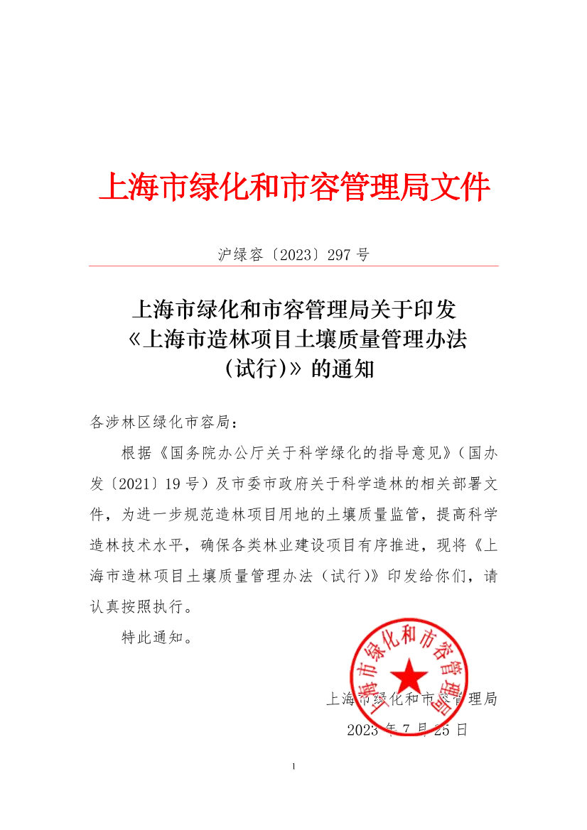 根据《国务院办公厅关于科学绿化的指导意见》(国办发〔2021〕19号)及市委市政府关于科学造林的相关部署文件,为进一步规范造林项目用地的土壤质量监管,提高科学造林技术水平,确保各类林业建设项目有序推进,现将《上海市造林项目土壤质量管理办法(试行)》印发给你们,请认真按照执行。