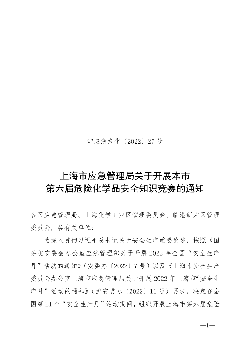 为深入贯彻习近平总书记关于安全生产重要论述,按照《国务院安委会办公室应急管理部关于开展2022年全国“安全生产月”活动的通知》(安委办〔2022〕7号)以及《上海市安全生产委员会办公室上海市应急管理局关于开展2022年上海市“安全生产月”活动的通知》(沪安委办〔2022〕11号)要求,决定在全国第21个“安全生产月”活动期间,组织开展上海市第六届危险化学品安全知识竞赛。现将有关事项通知如下。