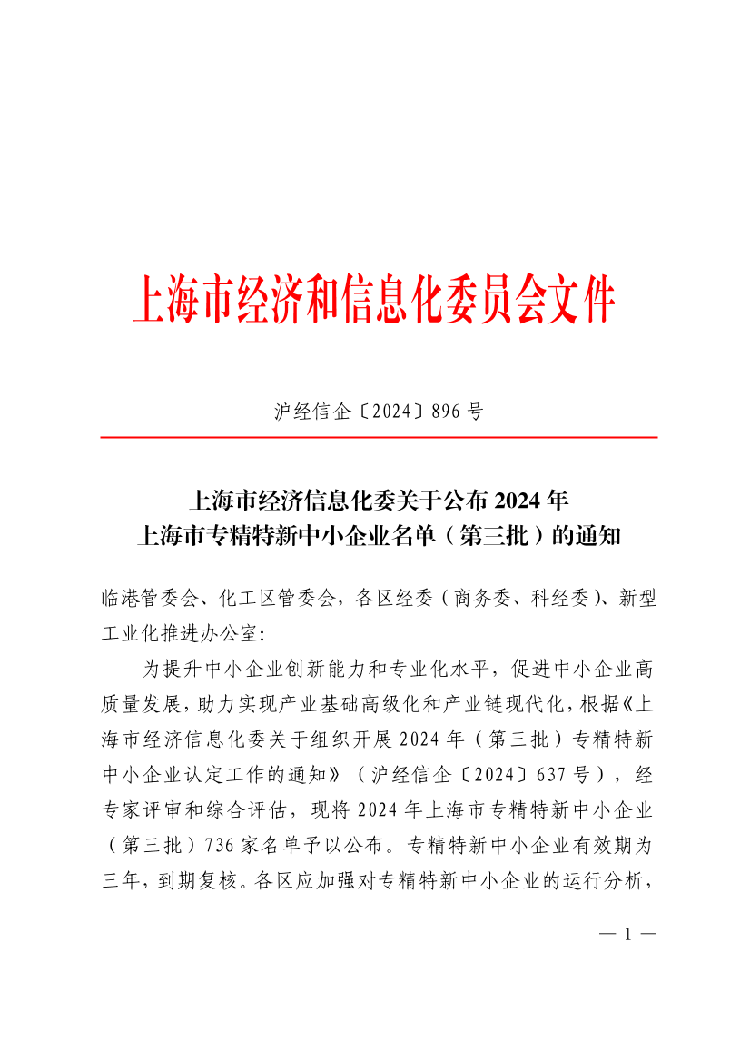 为提升中小企业创新能力和专业化水平,促进中小企业高质量发展,助力实现产业基础高级化和产业链现代化,根据《上海市经济信息化委关于组织开展2024年(第三批)专精特新中小企业认定工作的通知》(沪经信企〔2024〕637号),经专家评审和综合评估,现将2024年上海市专精特新中小企业(第三批)736家名单予以公布。专精特新中小企业有效期为三年,到期复核。各区应加强对专精特新中小企业的运行分析,强化精准服务,快速、及时解决企业困难诉求,促进企业高质量发展。